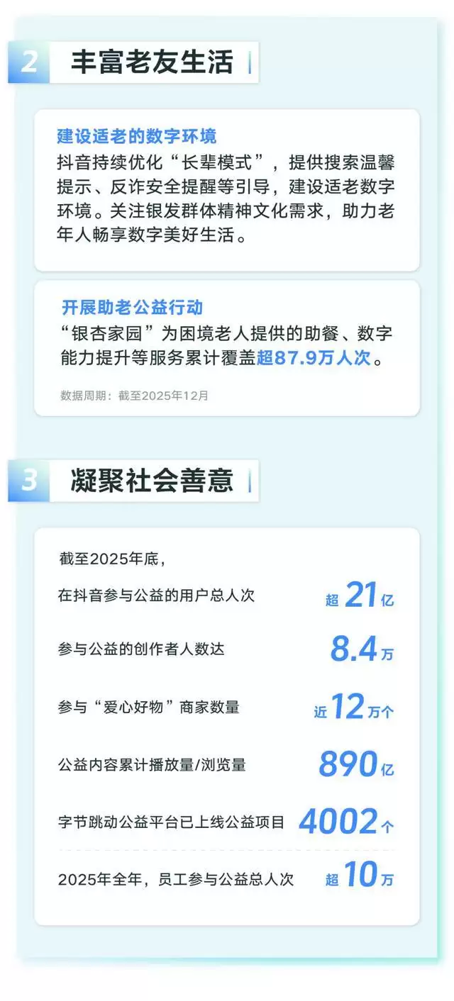 企业的温度,往往体现在其对公益事业的投入上。字节跳动依托其庞大的平台优势,成为连接与传递社会善意的枢纽。截至2025年底,有超过21亿人次在抖音平台上参与了公益行为;字节跳动的员工全年参与志愿活动的人次也超过了10万。为了守护下一代健康成长,抖音开设的《未成年人陪伴周刊》累计播放量达13.7亿;“抖音足球少年行”为约47万名青少年提供了足球运动支持;“抖音唇腭裂关爱行动”则助力超过4700名唇腭裂患儿完成了修复手术。同时,平台不断优化“长辈模式”,推进产品的适老化与无障碍化改造;字节跳动公益的“银杏家园”项目累计服务困难老人87.9万人次。这些数字背后,是切实的行动与温暖。