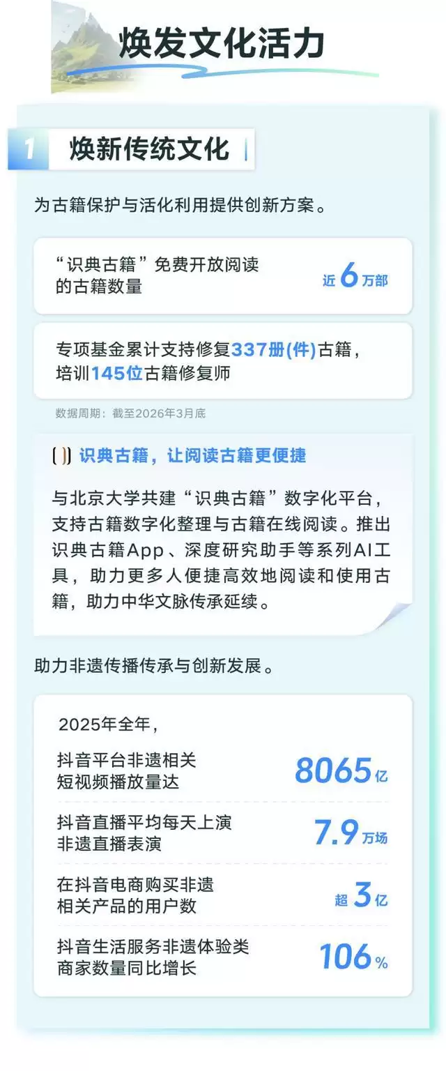 数字技术与人工智能的深度应用,也为文化的传承与创新注入了全新活力。在古籍保护这一传统领域,“识典古籍”平台免费开放阅读的古籍已超6万部,月均服务用户达240万人次,让沉睡的典籍重新“活”了起来。在非遗传承方面,抖音平台非遗相关视频在2025年的播放量达到8065亿,更有超过3亿用户通过抖音电商购买了非遗好物,实现了“以用促保”。此外,知识普惠也在以更轻盈的方式落地。抖音精选与100多所高校合作开设“公开课”,累计吸引了1.45亿用户参与,观看量达7.6亿次,构建了一座没有围墙的大学。