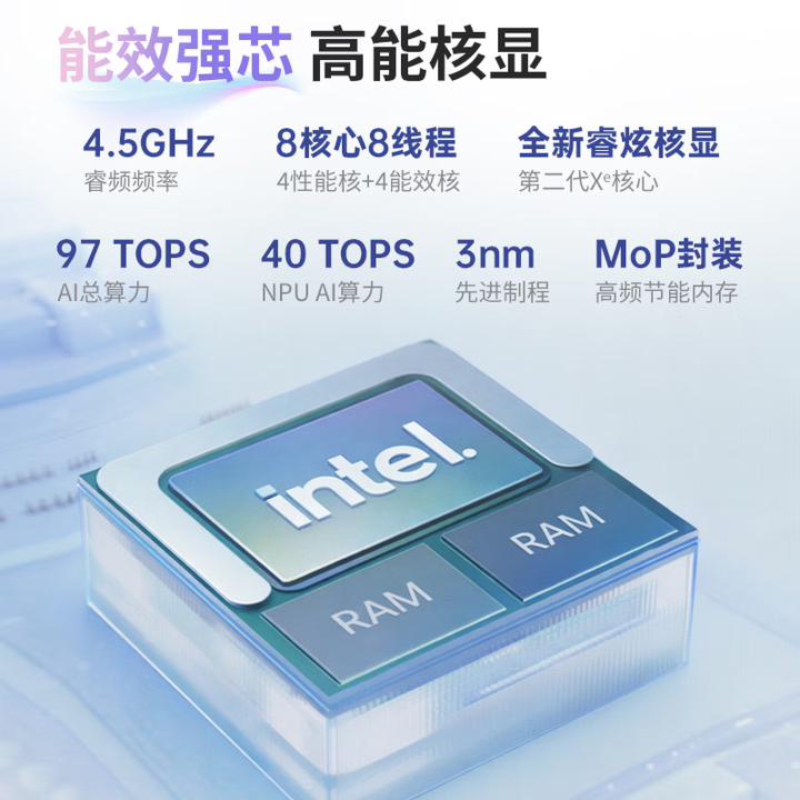 性能部分是此次升级的重头戏。这款笔记本搭载了英特尔新一代Lunar Lake处理器,其NPU算力达到了45 TOPS,使得整机AI算力突破了100 TOPS。一个关键变化是,它首次采用了CPU封装内存技术,直接将16GB或32GB的LPDDR5X-8533高频内存集成在了处理器基板上。