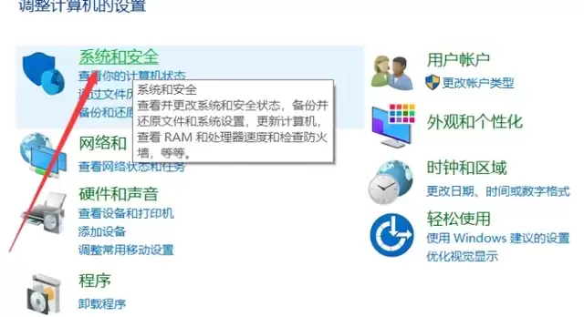 打开控制面板后,你会看到按类别排列的选项。找到并点击“系统和安全”这个大类。