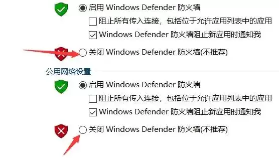 现在,你来到了核心设置页面。你会看到针对“专用网络设置”和“公用网络设置”的两个选项。将这两个选项下的“关闭 Windows Defender 防火墙”都勾选上,然后点击“确定”。