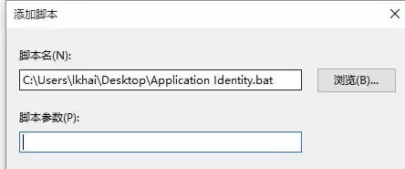 8. 这时会弹出“添加脚本”窗口。点击 【浏览】,找到并选中你刚才在桌面上创建的 【Application Identity.bat】 文件,然后点击 【打开】。