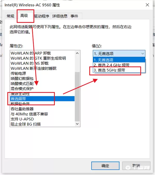 第四步,关键操作来了。在新打开的无线网卡属性窗口中,点击顶部的“高级”选项卡。在左侧一长串属性列表中,向下滚动,找到“首选频带”这一项。然后看右边,在“值”的下拉菜单里,果断选择“首选 5GHz 频带”,最后点击“确定”保存。