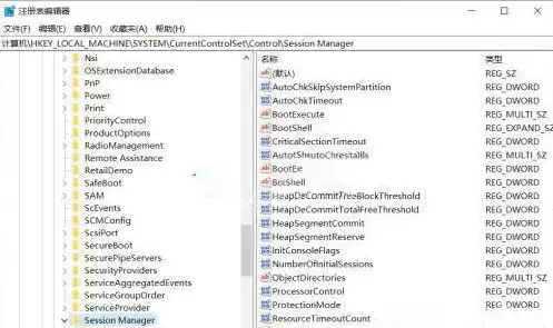 第三步:接下来需要定位到具体的路径。在注册表编辑器左侧的树状目录中,依次展开并找到这个位置:HKEY_LOCAL_MACHINESYSTEMCurrentControlSetControlSession Manager。