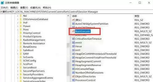 第四步:在右侧的数值列表中,找到名为 BootExecute 的选项。用鼠标双击它,就可以打开编辑窗口。