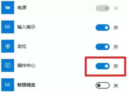 4. 这时会看到一个系统图标列表。在里面找到【操作中心】,将它右侧的开关滑块点一下,切换到“开”的状态,这个功能就成功启用了。