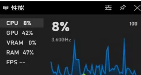 4. 在出现的工具栏中,找到“性能”模块(通常显示为FPS、CPU、GPU等),将鼠标移到“FPS”这项上。初次使用时,可能会看到一个“请求访问权限”的按钮,点击它。