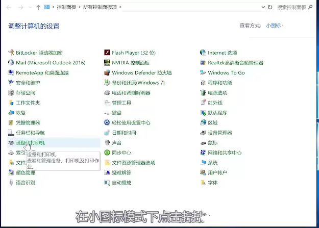 进入控制面板后,注意看右上角。默认的查看方式可能不太方便,建议点击下拉菜单,将其切换为 【小图标】 查看方式。这样,所有设置项都会一目了然地排列出来。然后,在列表中找到并点击 【设备和打印机】。
