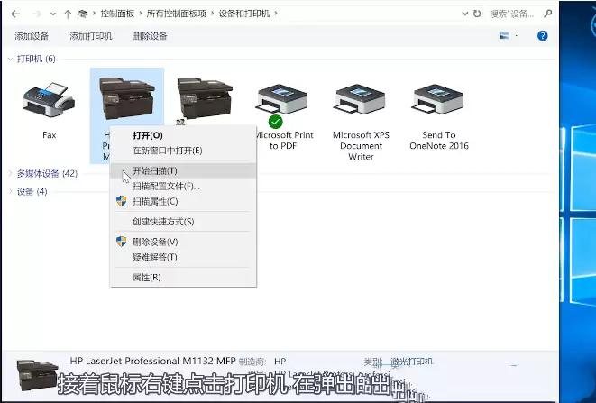 在“设备和打印机”窗口里,你会看到已连接的打印机图标。用鼠标 右键点击 你的打印机图标,在弹出的菜单中,选择 【开始扫描】 选项。