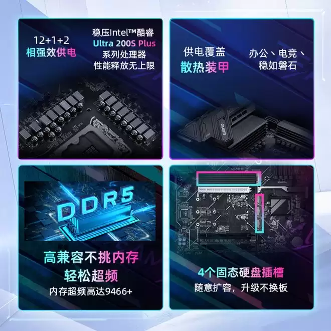 主板堪称一台主机的灵魂,直接决定了整机的性能上限、扩展性和稳定性。技嘉本次带来的三款主板,精准覆盖了 Intel 旗舰、AMD 高端电竞、主流性价比三大装机赛道,足以匹配不同玩家的核心需求。