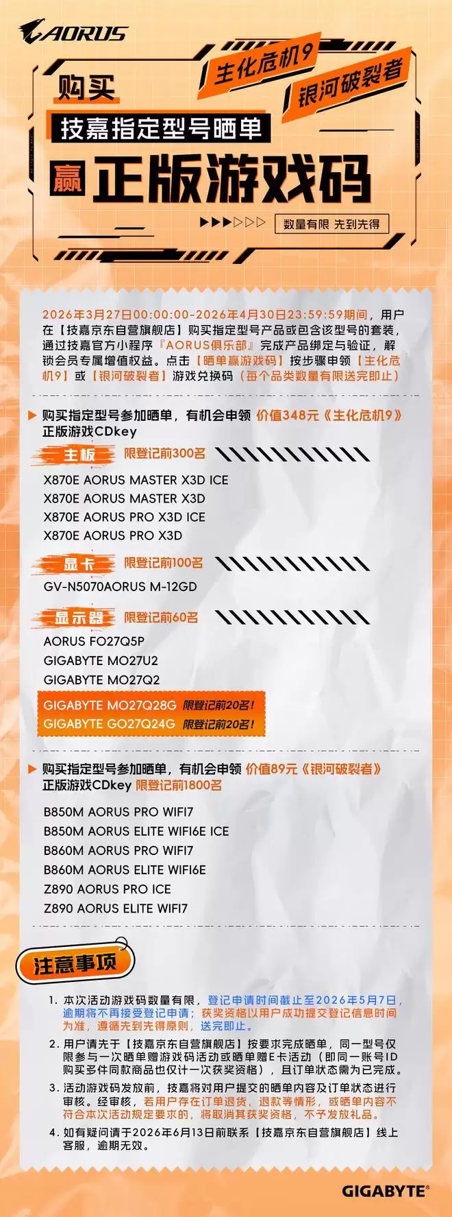 在 2026 年 3 月 27 日至 4 月 30 日期间,前往【技嘉京东自营旗舰店】购买指定型号单品或套装,即可参与晒单赠礼活动。用户只需在技嘉最新小程序「AORUS 俱乐部」中完成产品绑定与验证,不仅能解锁会员专属增值权益,点击进入【晒单赢游戏码】页面并按步骤操作,还能申领《生化危机 9》或《银河破裂者》游戏兑换码。