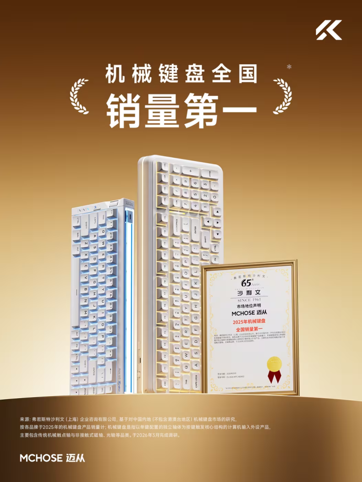 正是这份扎实的产品硬实力和对用户需求的精准洞察,让迈从的行业地位获得了权威背书。全球知名咨询机构沙利文将其认证为“2025年机械键盘品类全国销量第一”,这无疑是对其稳居国内外设行业第一梯队的实力肯定。