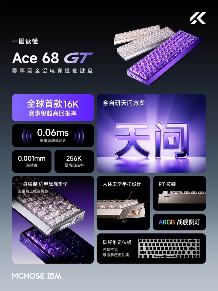先看性能核心。Ace 68 GT搭载了迈从全自研的“天问”方案。这里有个关键点值得圈出来:这是目前量产全铝磁轴键盘市场中,首个且唯一实现了16K超高回报率的方案。相比之下,行业主流还停留在8K。这意味着什么?其信号响应延迟被压缩到了惊人的0.06ms。别小看这个数字,在分秒必争的电竞赛场上,它能精准捕捉到玩家每一个细微到极致的操作,从而大幅降低因设备延迟导致的失误。这对于追求极限的职业玩家而言,无疑是“物理外设”级别的提升。