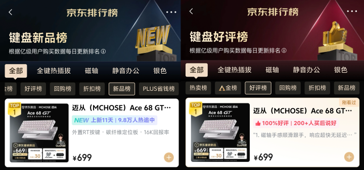 3月2日,迈从打出了一张王炸牌——正式推出其2026年度旗舰赛事级全铝磁轴键盘Ace 68 GT。这可不是一次简单的产品迭代。一个直击电竞玩家痛点的精准定位,加上性能、手感、设计与质感几乎没有短板的全能表现,让它一经亮相便强势破圈。市场反响是最直接的证明:开售仅三天,这款键盘便迅速登顶京东键盘品类的新品榜与好评榜双榜首,在职业选手、硬核玩家和广大外设爱好者中引发了热烈讨论。