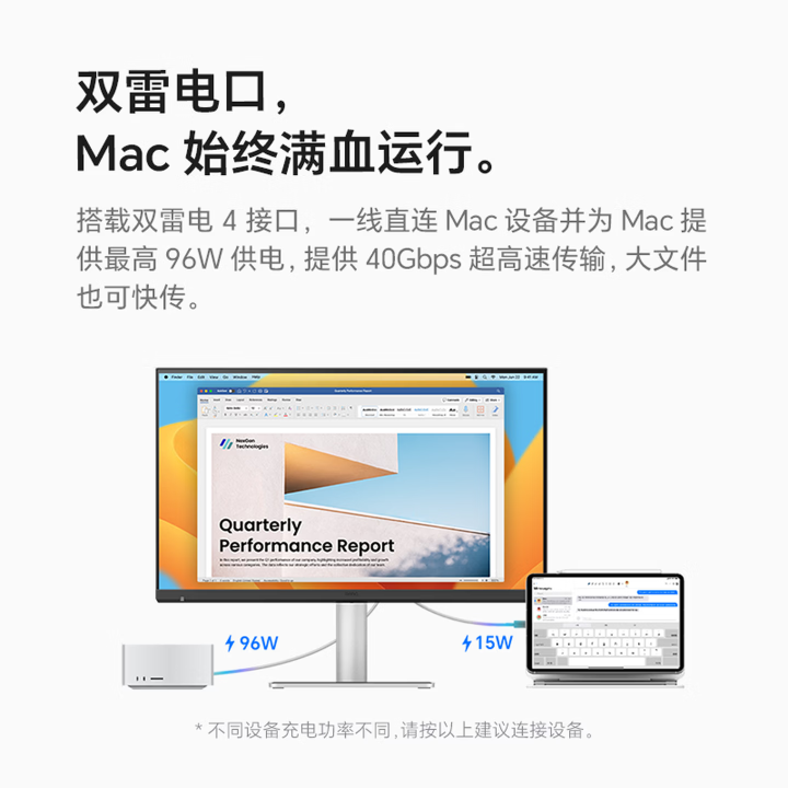 便捷性方面,它兼容macOS的快捷键操控,用户可以直接用键盘调整显示器设置。更关键的是,一个雷电4接口就能实现视频、数据传输和电力供应,真正做到“一线连”,极大简化了桌面布线。