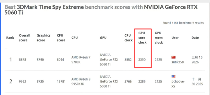 目光下移,定位更亲民的甜品级市场同样有好戏。技嘉RTX 5060 Ti 8G魔鹰的表现,可以说超出了许多人对这个级别产品的预期。在压力更大的3DMark Time Spy Extreme测试中,其核心频率突破了3.33GHz。这说明什么?意味着即便是主流价位段的产品,技嘉也赋予了它相当可观的超频余量和性能释放空间,这对于追求性价比的玩家而言,无疑是个好消息。