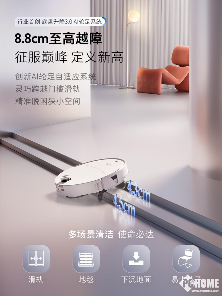 对于大多数家庭而言,门槛和厚地毯堪称扫地机器人的两大“传统劲敌”。以往的产品,大多依靠驱动轮的简单抬升来越障,面对稍高一点的门槛或蓬松的地毯,往往就束手无策。