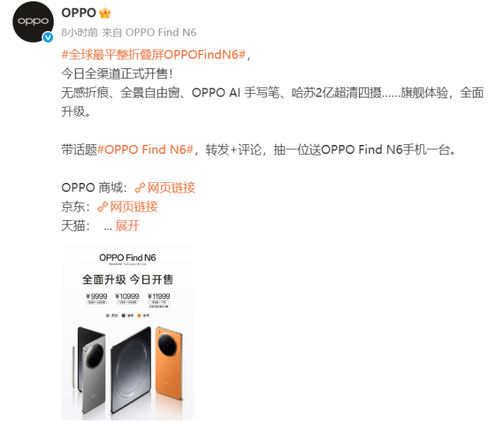 最近手机圈有个现象挺有意思:OPPO Find N6折叠屏旗舰正式开卖,结果1TB的版本一下子就卖断了货。官方已经表态,正在加紧备货,努力不让消费者的热情落空。