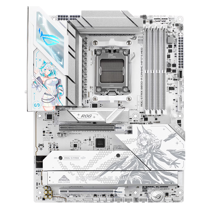 视觉设计是这款主板最吸睛的部分。它采用了彻底的“全白”二次元设计语言,从PCB基板、各类插槽到厚重的VRM散热装甲,乃至随附的配件,均以纯白配色呈现。为了强化这一主题,其I/O护甲上还特别融入了国行特供的“吹雪姬”双层立绘,再配合极具流动感的曲线光纹铭板以及支持AURA SYNC神光同步的ARGB灯效,可以说为打造一台高颜值的“白色海景房”主机提供了完美的基底。
