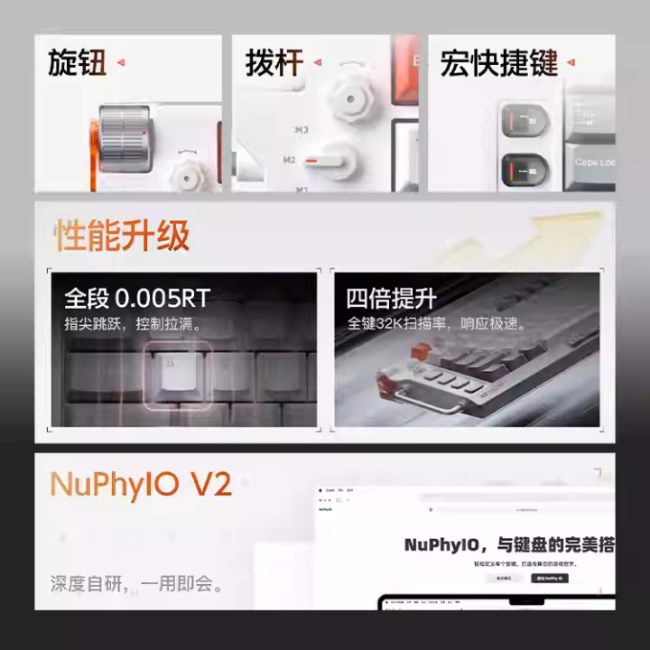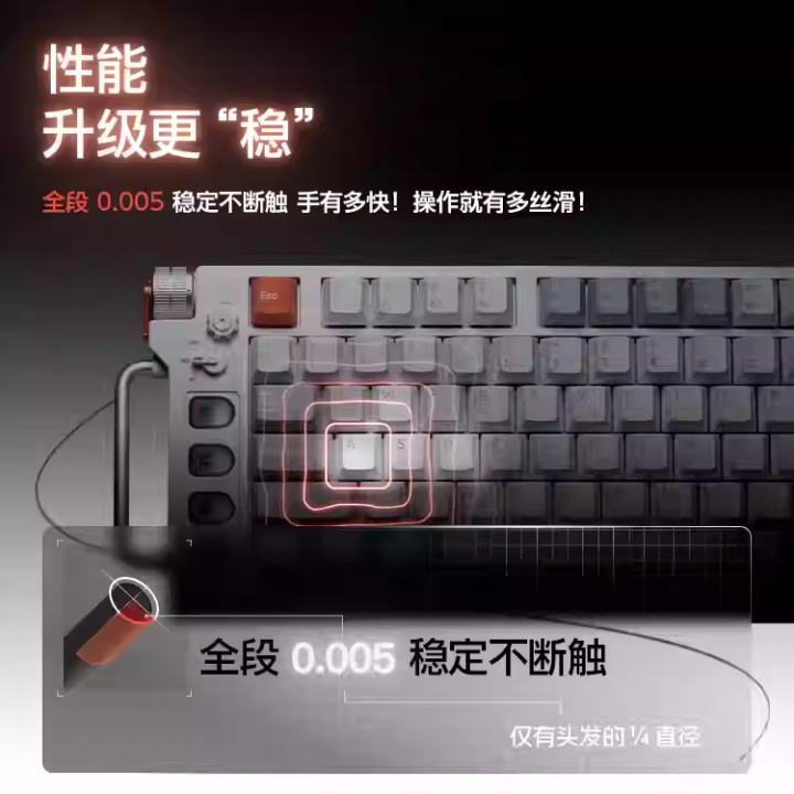 说到核心性能,这款键盘的配置相当能打。它搭载了精度可达0.005毫米的Rapid Trigger快速触发功能,允许用户在0.001毫米到3.3毫米之间自由定义触发键程。再配合32kHz的全键扫描率与8kHz的回报率,真正实现了全键无冲与超低延迟输入。对于FPS游戏玩家而言,这种配置意味着急停、连跳这类精细操作会更加跟手,断触、失灵的风险被大幅压低。