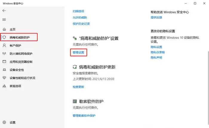 第三步,找到病毒防护设置。在新打开的Windows安全中心界面,将目光转向左侧菜单,选择 【病毒和威胁防护】。紧接着,在右侧区域找到 【病毒和威胁防护设置】 下的“管理设置”,并点击它。