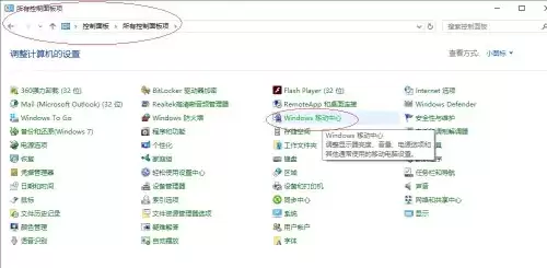 第二步,在控制面板界面,我们需要找到“Windows移动中心”这个图标。它通常是针对笔记本和平板电脑的移动功能集合。