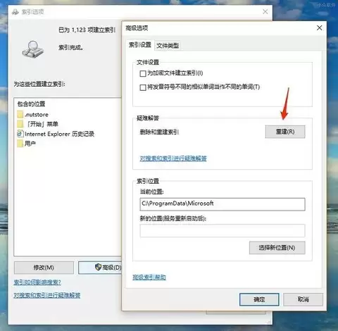 在高级选项中,点击“重建”按钮可以重置索引,这能有效缩减其体积。更进一步,你还可以点击“选择新的位置”,把整个索引数据库迁移到其他分区(比如D盘或E盘),从而为C盘省出空间。