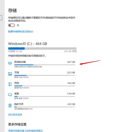 很多第三方软件默认安装在C盘,它们才是占用空间的“大户”。回到“存储”设置界面,点击“应用和功能”。