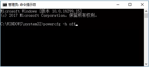 在弹出的黑色命令窗口中,输入命令:powercfg -h off,然后按下回车。执行成功后,休眠功能即被关闭,相应的数GB空间也会被释放。(如果需要重新开启,输入命令 powercfg -h on 即可。)