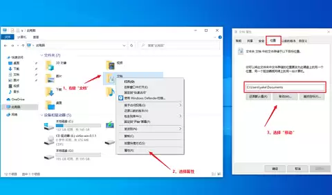 对于C盘里已经存在的“文档”、“下载”、“桌面”等个人文件夹,也可以手动迁移。打开“此电脑”,在“文档”文件夹上右键,选择“属性”,切换到“位置”选项卡,点击“移动”。
