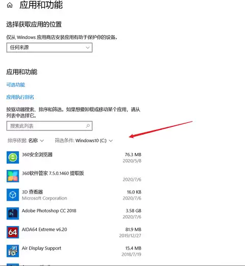 关键一步来了:将右上角的“筛选条件”设置为“Windows 10 (C:)”。这样一来,所有安装在C盘的应用及其占用空间便一目了然。平时不小心被捆绑安装的软件,或者那些体积庞大却很少使用的程序,都可以在这里逐一卸载,效果立竿见影。