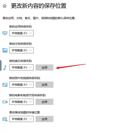 在这里,你可以将新应用、文档、音乐等内容的默认保存盘符从C盘改为其他盘(如F盘),然后点击“应用”。这样,未来生成的文件就不会再挤占C盘空间了。