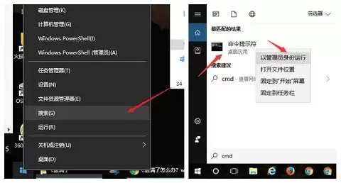 最后这个方法,适合那些不需要“休眠”功能的用户。系统休眠时会将内存数据写入硬盘,会生成一个体积巨大的休眠文件(hiberfil.sys)。要关闭它,需要在开始菜单上右键,选择“搜索”,输入“cmd”,然后在搜索结果中的“命令提示符”上右键,选择“以管理员身份运行”。