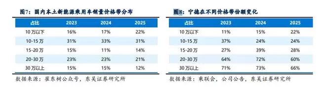 而在这个战场上,宁德时代恰恰是相对弱势的一方。在20万元以上的高端市场,其市场份额超过60%,赛力斯、理想、宝马、小米等都是其核心客户。但在10万元以下的低端市场,其份额就骤降至22%左右。
