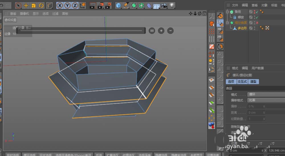 第四步,进入塑造螺纹的关键环节。选中螺纹主体部分的线,但记得取消选择两端的那一小段。然后,对选中的线执行“倒角”命令,将“细分”设置为1。完成倒角后,选中新生成的那圈中间线,进行缩放操作(建议切换至模型的顶视图或俯视图进行,这样更精准)。至此,螺纹的基本形态就已经出来了。