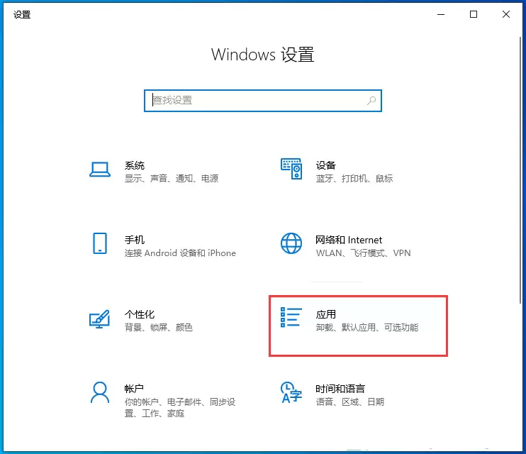 进入Windows设置窗口后,你会看到顶部的搜索框。当然,我们也可以直接手动查找。在设置主页中,找到并点击 【应用(卸载、默认应用、可选功能)】 这一项。