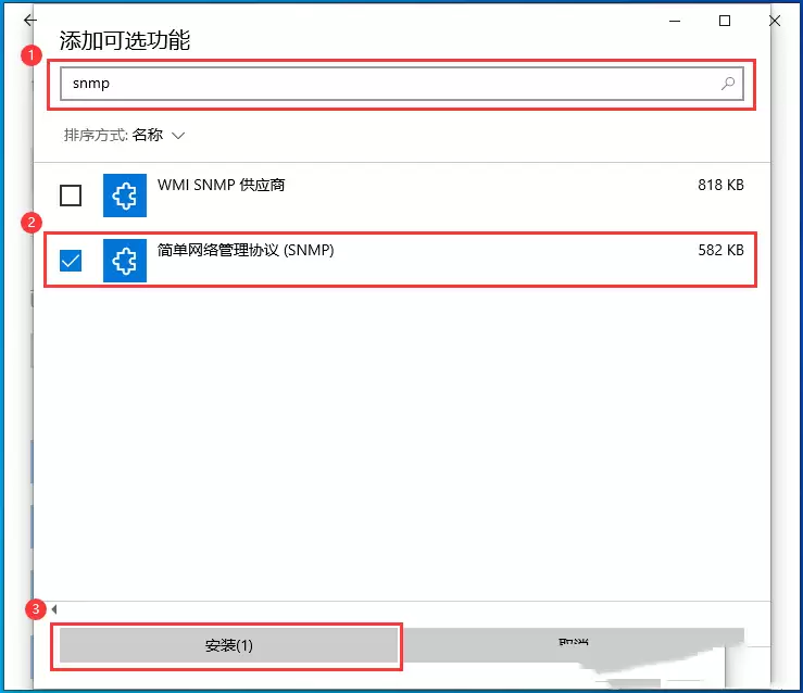 这是最关键的一步。点击“添加功能”后,会弹出一个包含大量可选功能的窗口,顶部有一个搜索框。直接在搜索框中输入 【snmp】,下方的列表会迅速筛选出相关结果。找到 【简单网络管理协议(SNMP)】 这一项,勾选它前面的复选框,然后点击右下角的 【安装】 按钮。