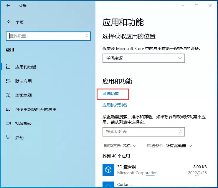 接下来,在“应用”设置窗口的左侧边栏,确保选中了 【应用和功能】。然后,将目光转向右侧,点击 【可选功能】 这个选项。