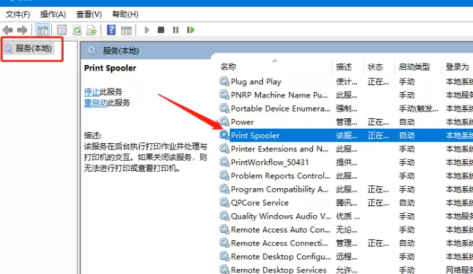 2、进入服务界面后,找到名为 **Print Spooler** 的这一项。这个服务你可以理解为打印任务的“调度中心”,它要是停工了,添加打印机自然无从谈起。