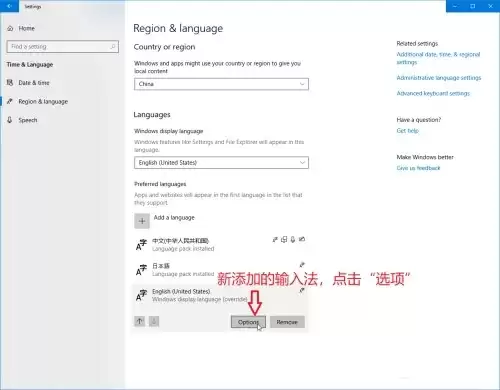 语言添加好后,回到“区域和语言”页面,点击目标语言(例如“英语(美国)”),下方会出现一个【选项】按钮,点击它。