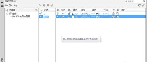 弹出的这个窗口界面,便是“图层特性管理器”。里面列出了当前文档中的所有图层及其属性。先花点时间熟悉一下这个界面布局,接下来的操作都将在这里进行。