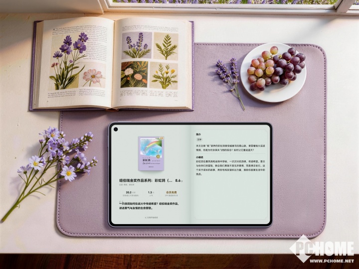 相比之下,华为MatePad Mini悦读版的幻影紫则显得更加轻盈灵动,这与它主打便携阅读的定位十分契合。幻影紫配色搭配3D锦纤材质机身,触感温润细腻,带有亲肤的舒适感。机身薄至5.1毫米,重量仅为255克,极致轻薄的体积可以轻松放入口袋或随身小包,单手握持阅读几乎感觉不到负担。