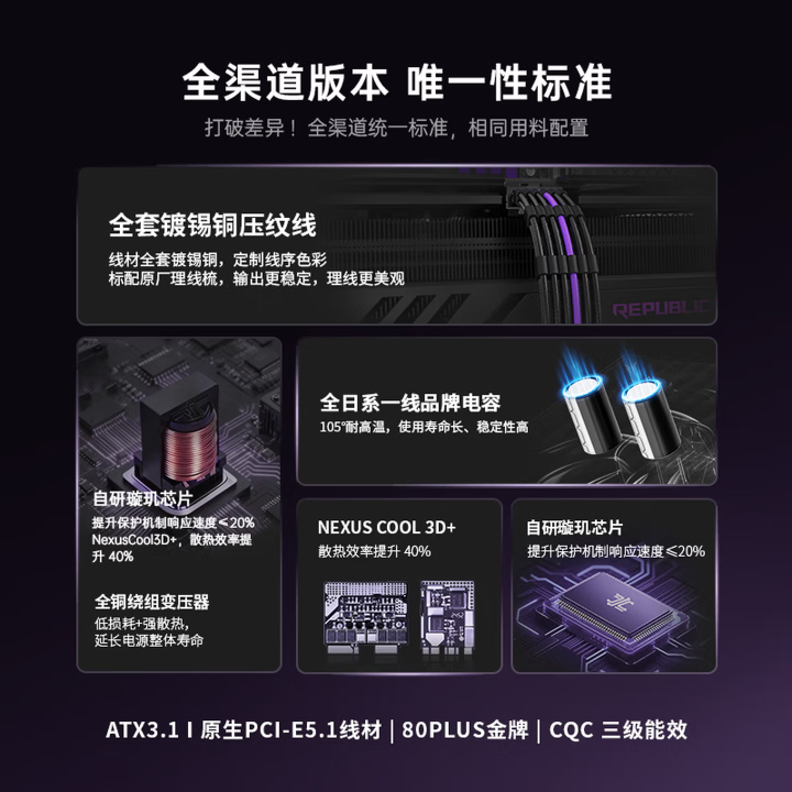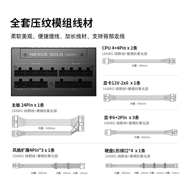 除了内在性能,外在的细节也照顾到了玩家的个性化需求。随电源附赠的黑紫撞色镀锡铜压纹模组线,不仅保证了出色的导电性能,其独特的配色和柔软的材质,更能方便布线,显著提升机箱内部的整体观感,让理线也成为展示个性的一部分。