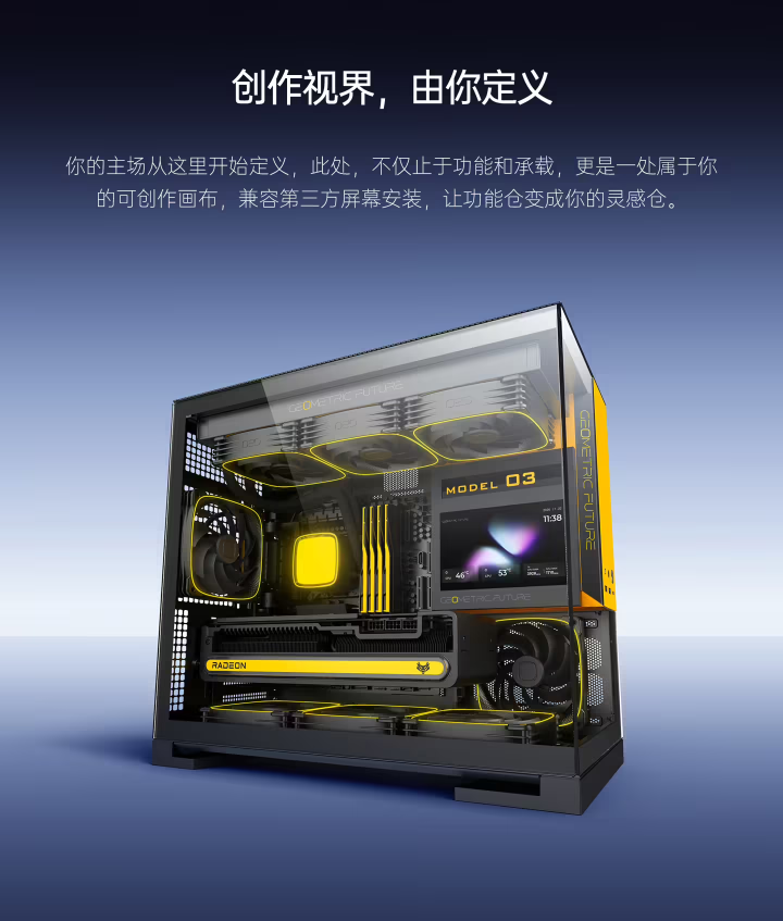 总体来看,几何未来Model 3的推出,与其之前发布的几款产品形成了有效的风格与定位互补。这标志着品牌产品矩阵正朝着更多元、更细分的方向构建,旨在精准覆盖不同装机场景和个性化审美。从硬核结构到软性展示,这款机箱让“硬件即艺术”的理念,有了更具体、更全面的落地方式。