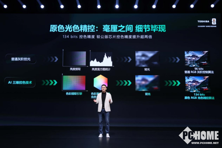 有了好硬件,还需要一颗强大的“大脑”。东芝全新升级的自研ZRα AI光色同控芯片,完成了一次行业跨越:从二维控光,进化到三维光色同控。它内置的AI三维控色算法,能够智能识别画面内容,对亮度与色彩进行同步协同调控,控色精度高达134bits。这一精度的实现,使得其对色调、饱和度、亮度的控制能力,较普通SOC芯片提升了超过400%。当这项技术驱动最高四万级控色分区时,呈现出的结果便是色彩层次更精细、画面细节更丰富,最终实现了色彩视角提升50%、画面均匀性提升30%、以及光晕减少60%的显著画质跃升。