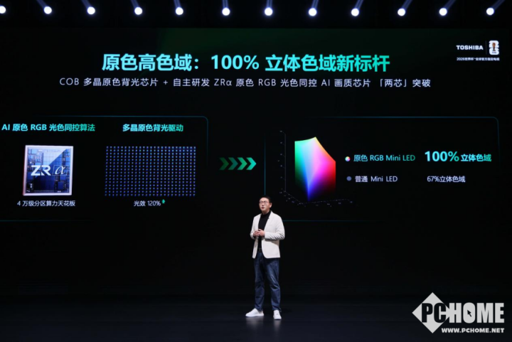 一切的起点在硬件。东芝采用了多晶三原色背光芯片,实现了极高的色彩纯度——红、绿、蓝三色的纯度分别达到了99%、92%和100%。这意味着色域覆盖最高可触及110% BT.2020,相比普通Mini LED提升了近30%,即便相较于OLED,也提升了近10%。可以说,从光源的源头,就为真实的色彩还原打下了坚实基础。
