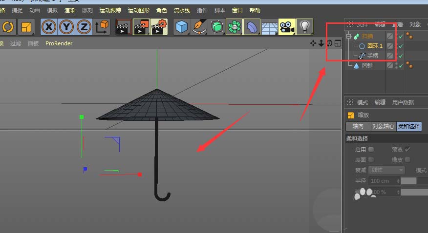 最后一步,生成实体。再创建一个小的“圆环”对象作为扫描的横截面。然后,使用“扫描”生成器,将刚才画好的线条路径和这个小圆环放进去。看,一个完整、立体的雨伞模型就这样轻松诞生了。