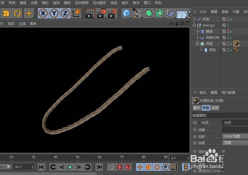 尝试调整样条约束的轴向,比如改为Y轴,模型应该会恢复正常走向。但仔细看,绳子的表面可能依然不光滑,显得生硬。