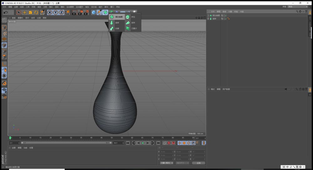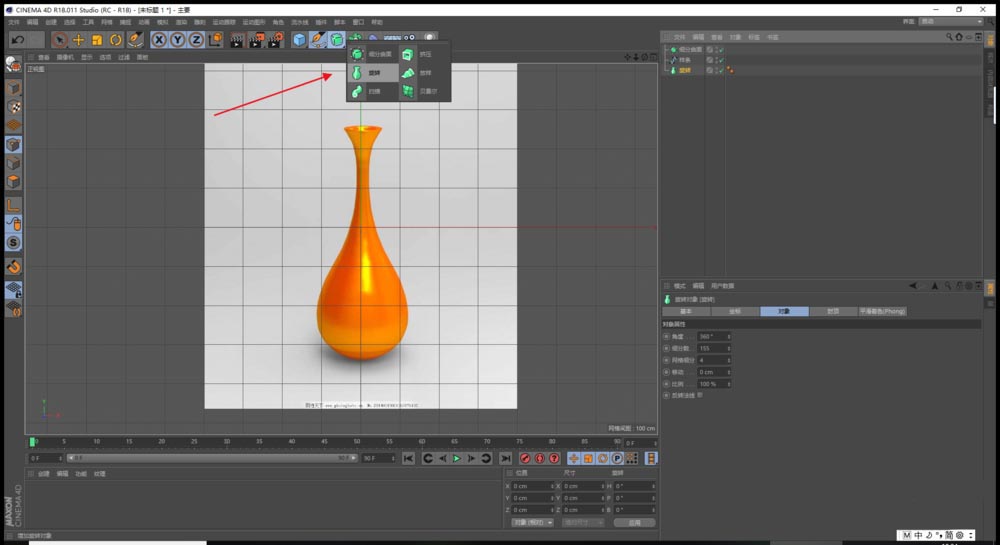 线画好,重头戏就来了。从生成器菜单中选择“旋转”,然后把刚刚画好的样条线直接拖到“旋转”对象的子层级里。神奇的一幕立刻发生——一个完整的立体瓶身瞬间呈现。