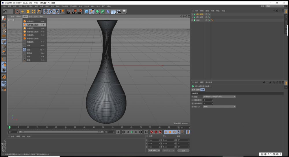 不过,此时的瓶子棱角可能还比较分明。为了让模型更细腻,我们祭出“细分曲面”这个平滑利器。新建一个细分曲面,再把刚才的“旋转”对象拖入其子层级。这时候,可以按快捷键 N-B 切换到“光影着色(线条)”模式,这样既能看清平滑后的效果,又能保留结构线参考,非常方便。
